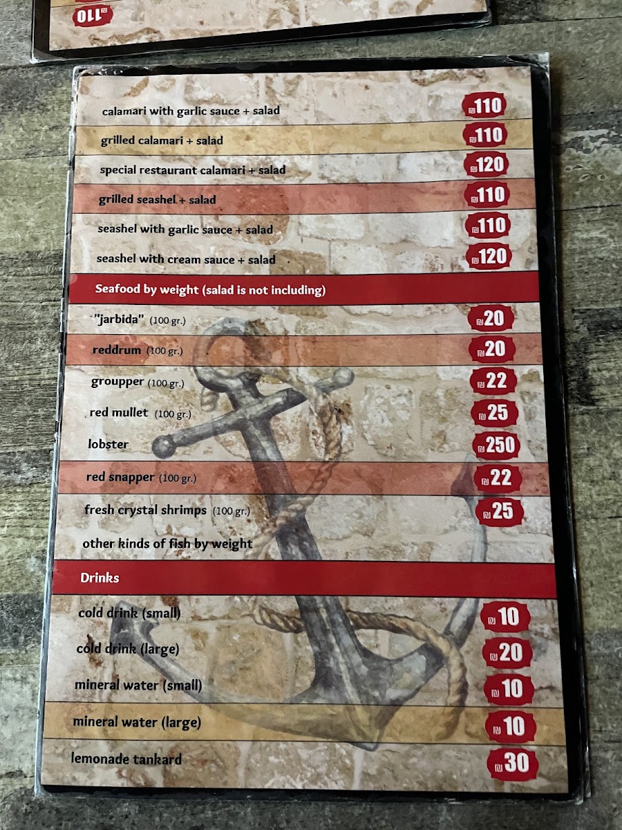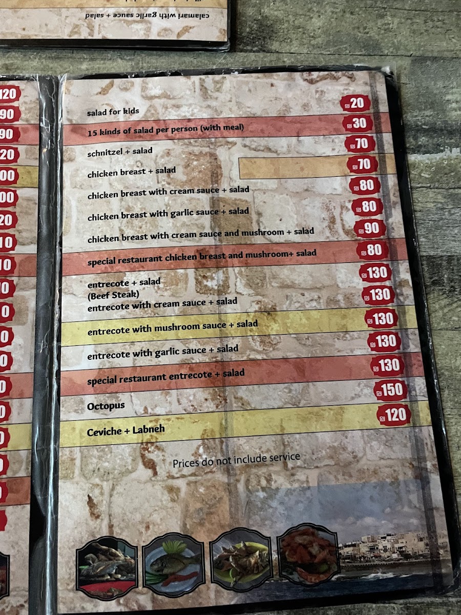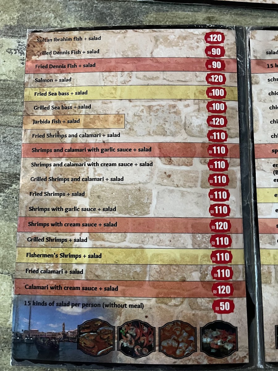 The menu at Fishers' Restaurant in Acre offers a diverse and exciting range of dishes, with a focus on fresh seafood. For those looking to enjoy lighter options, there are several Salads and a tempting selection of Mouthwatering Seafoods such as Prawns and Fried Calamari. The variety of Fish available, including the popular Grilled Sea Bass (לברק בגריל) and Grilled Nile Perch (דג מוסר על הגריל), is a highlight for any seafood lover. These dishes offer a perfect balance of flavors, expertly prepared to bring out the natural freshness of the fish.